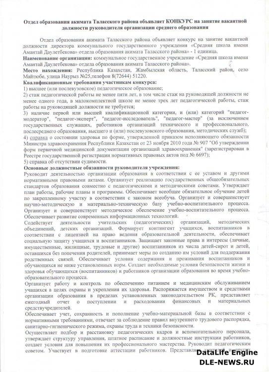 Талас ауданы әкімдігінің білім бөлімі мемлекеттік орта білім беру ұйымы басшыcының бос лауазымына КОНКУРС жариялайды